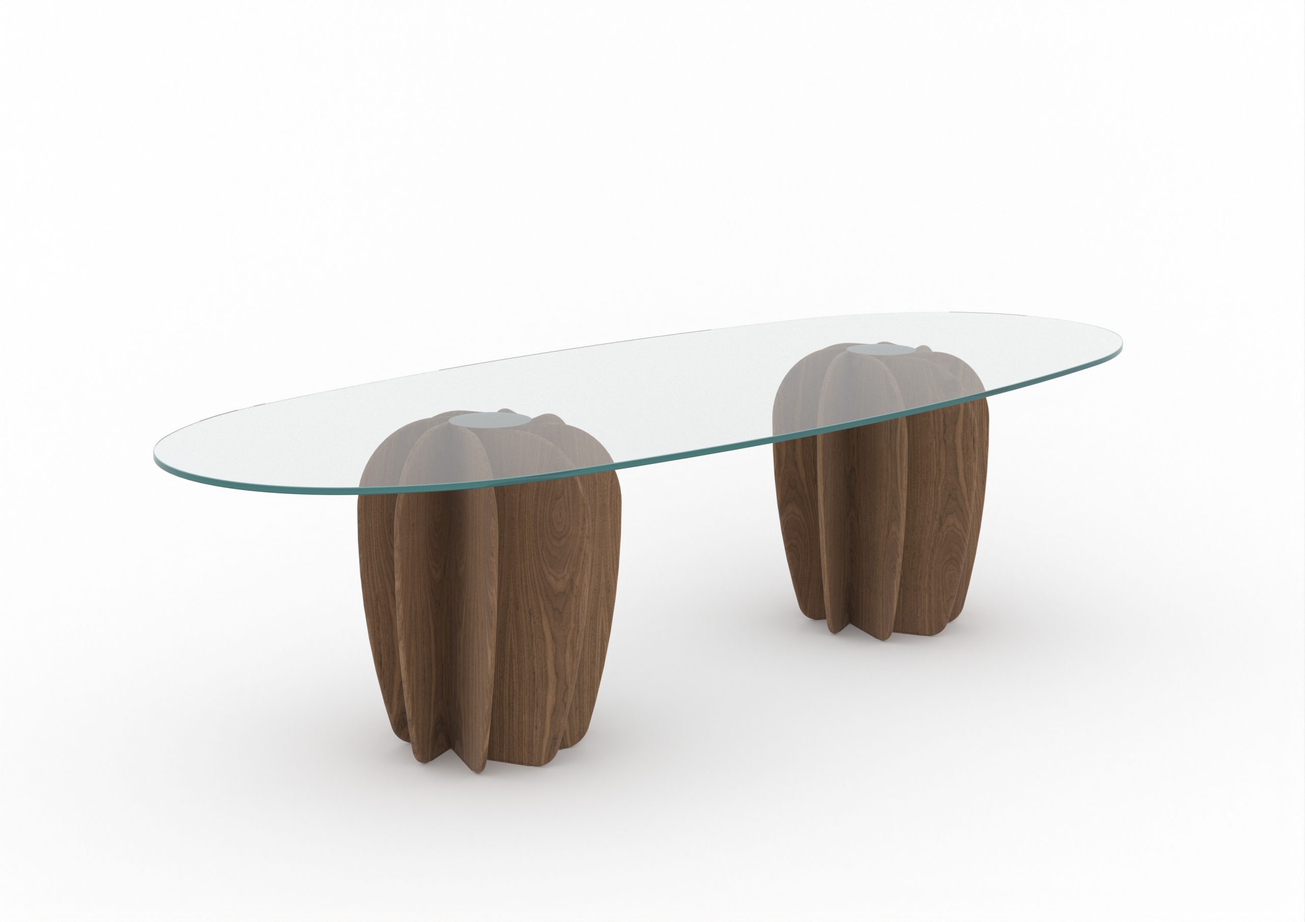 - Sculptural Base Design Walnut legs shaped like petals forming a totem-like structure